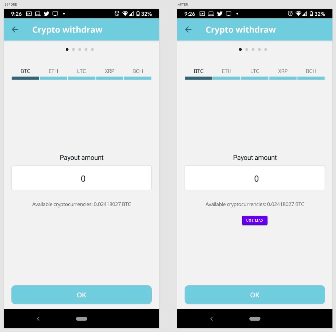 The added USE MAX button could allow the user to use automatically enter the full amount of the wallet into the field, without having to do it by hand.